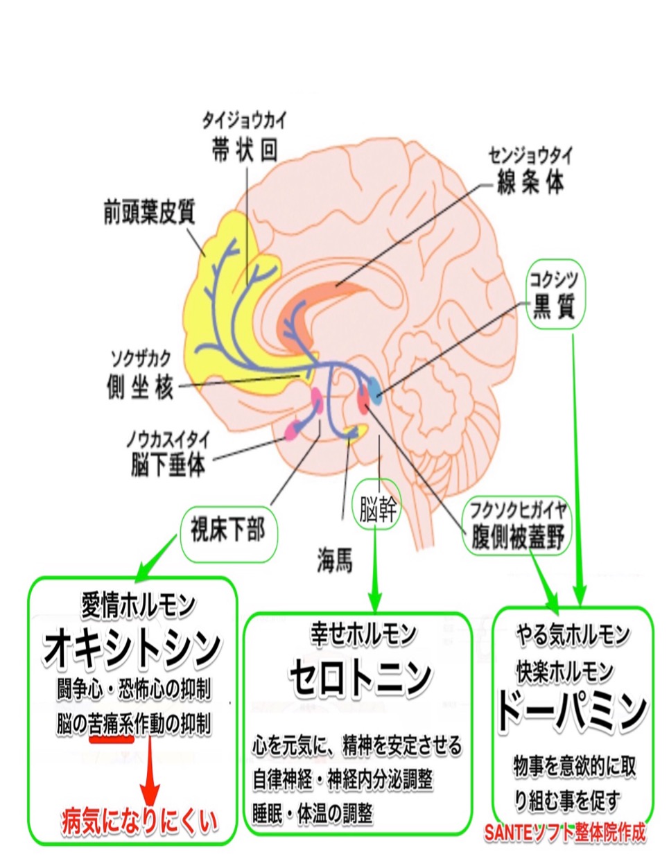 「心地よい、快」によりドーパミンが分泌されると前頭葉と海馬に働かせ、下記の図のようにセロトニン、オキシトシンも分泌されます。