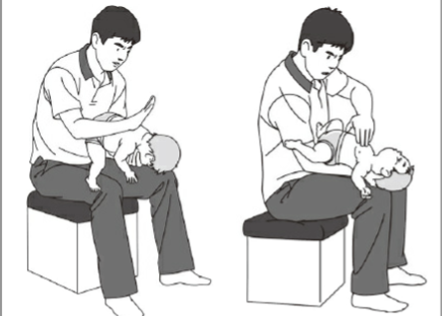 腹部突き上げは行いません。 背部叩打では、片方の手で乳児のあごをしっかり持ち、その腕に胸と腹を乗せて頭側を下げるようにしてうつ伏せにし、もう一方の手のひらの基部で背部を力強く数回連続してたたきます