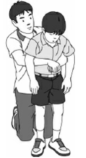 腹部突き上げと背部叩打は、その場の状況に応じてやりやすい方 法を実施してかまいませんが、1つの方法を数度繰り返しても効果 がなければ、もう1つの方法に切り替えてください。異物が取れるか反応がなくな るまで、2つの方法を数度ずつ繰り返して続けます。