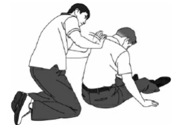 背部叩打法 立っている、または座っている傷病者では傷病者の後方から手のひらの基部(手掌 基部)で左右の肩甲骨の中間あたりを力強くたたきます。