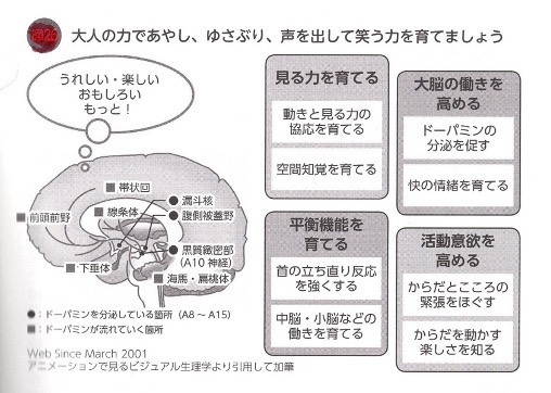 リズミカルな心地よい揺れの刺激は、中脳にあるA10神経からドーパミンと言うホルモンを分泌させます。ドーパミンの刺激は視床下部を通って大脳辺どうやればいいの緑系(海馬、扁桃体等がある所)を経て意欲、記憶を増進させます。さらに、大脳の前頭葉前夜でも刺激してその働きを高めていきます 図●